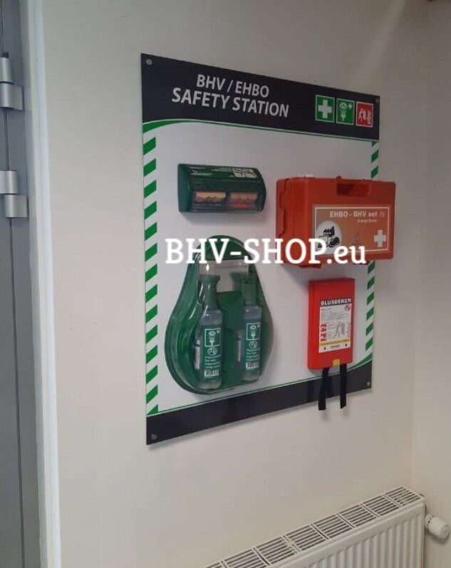 Safety-Station incl. BHV EHBO artikelen voor ICT ruimten. BHV EHBO Safety Station met afmeting 75x90cm inclusief BHV EHBO verbandkoffer, blusdeken oogspoelstation met twee flessen 500ml steriele oogspoeling, afgedekt met transparante afdekkap voor een optimale hygiene, pleisterdispenser met 40 textiel en 45 waterafstotende pleisters. Modern Safety Station om de BHV EHBO middelen overzichtelijk en centraal op één bord beschikbaar te hebben. Monteer de Safety Station voor de bouw in de bouwkeet van de uitvoerder. Bij levering worden de BHV EHBO artikelen los bijgeleverd. Met de meegeleverde tape met grote kleefkracht bevestigt u de artikelen aan het bord. Met kit, tape, popnagels of andere bevestiging materialen monteert u zelf de artikelen aan het bord. In de webshop meer van deze soorten complete en innoverende EHBO safety-stations.