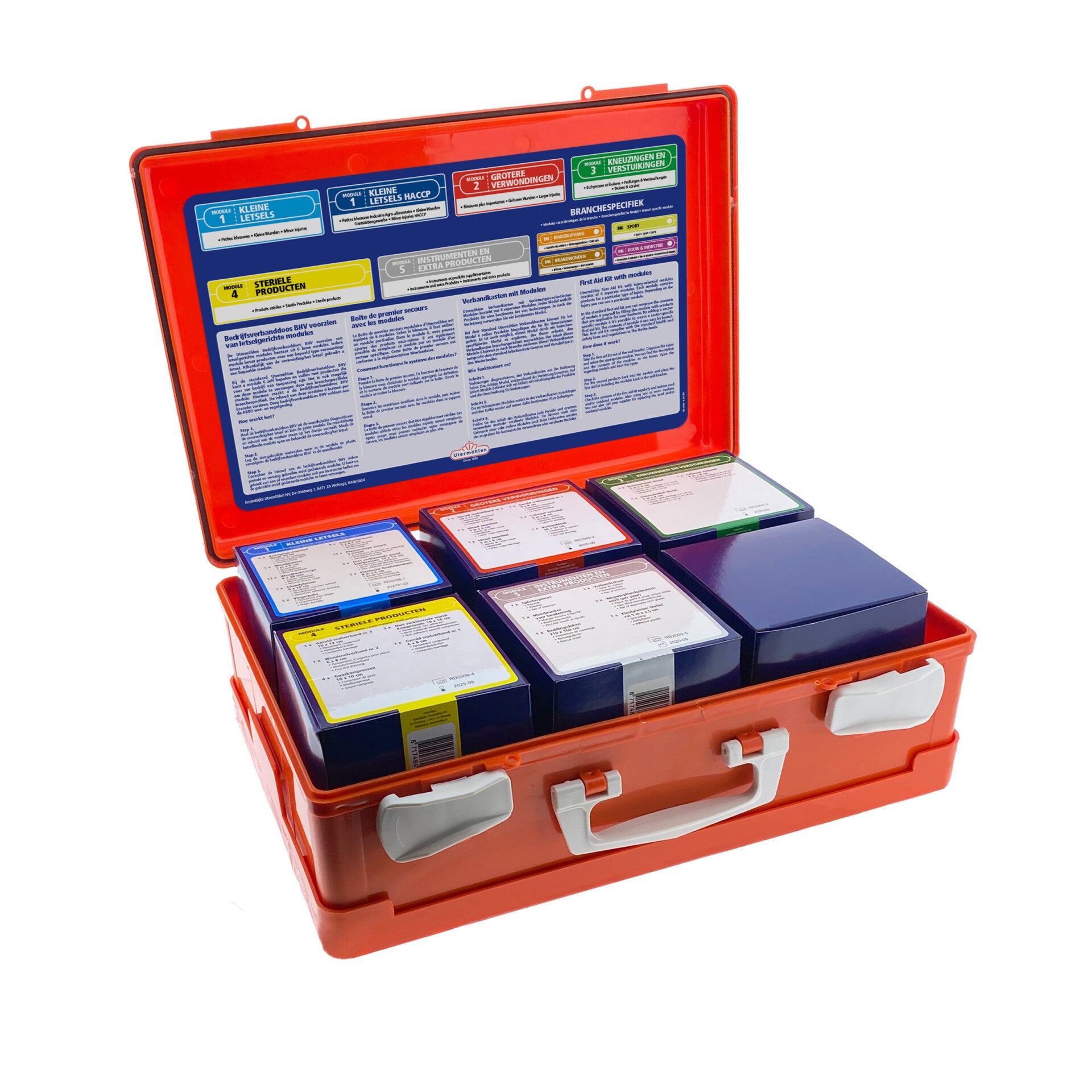 Verbandkoffers van Utermohlen zijn een onmisbare aanvulling op de werkvloer en zorgen ervoor dat bedrijven bij ongelukken en calamiteiten altijd over de juiste EHBO materialen beschikken. Per branche kunnen benodigde EHBO materialen voor wondverzorging verschillen. Verbandkoffers van Utermohlen zijn branchepecifiek te koop. De inhoud bestaat uit zes modules. Is er een module over de houdbaarheid datum dan dient alleen deze vervangen te worden. Hiernaast is grote voordeel van modulaire verbandkoffers dat meer gebruiksvriendelijk en overzichtelijk (elke module heeft eigen kleur) blijven. Bovendien zijn de modules snel en eenvoudig te vervangen waardoor u niet misgrijpt of producten gebruikt waarvan de houdbaarheid datum is verlopen. Met handige branchespecifieke bedrijfsverbanddozen direct de juiste inhoud voor uw branche! De verbandkoffer dient u periodiek te (laten) controleren zodat gebruikte en/of gedateerde modules worden vervangen. Voor deze service zijn wij u van dienst.