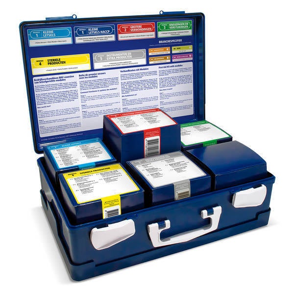 Stop de Bloeding module Utermohlen verbandkoffer. Module met wond verzorging artikelen voor verplegen van grote wonden die hevig bloeden. De andere vijf modules in de verbandkoffer bevatten elk specifieke artikelen voor een bepaald type verwonding waarbij module zes naar wens branche specifiek verkrijgbaar is. Modules gebruiksvriendelijk die zorgen voor een goed overzicht dankzij de eigen module kleur. Zo is een gebruikte module of een module met verlopen houdbaarheid datum snel en heel eenvoudig te vervangen. Zo blijven verbandkoffers op orde, grijpt u niet meer mis en worden geen wondverzorging artikelen met verlopen THT ingezet. Aanbieding verbandkoffers Utermohlen.