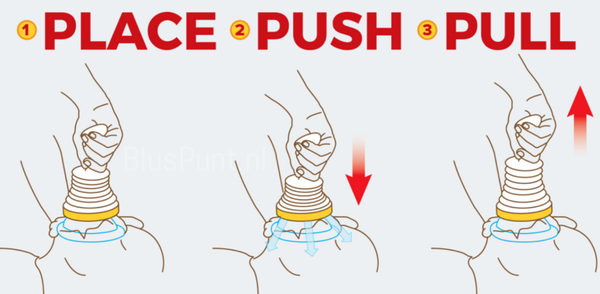 Plaats het masker op de LifeVac en plaats de LifeVac over de neus en mond van het slachtoffer. Met een krachtige beweging druk je de pomp omlaag. Door de speciale eenrichtingsklep ontsnapt de lucht naar buiten.