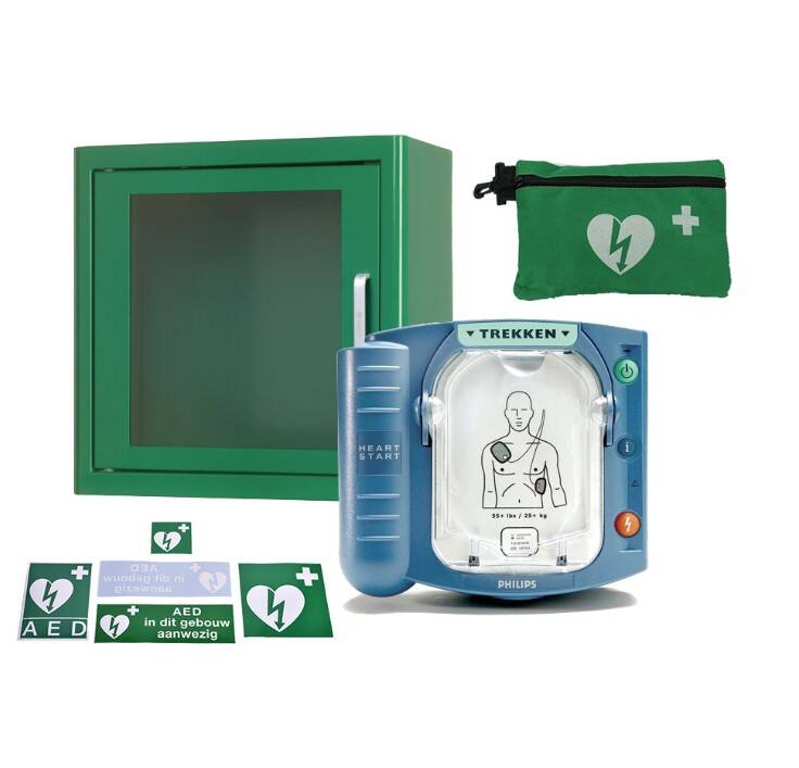 Philips HeartStart HS-1 AED. Philips AED uitermate geschikt voor gebruik door personen met geen of weinig ervaring met reanimatie. Door middel van spraak begeleiding helpt de AED u bij effectief reanimeren. De Philips Heartstart HS1 is de voordeligste aanbieding AED. Inzetbaar bij hartfalen op de werkplek, thuis onderweg en in de buurt. AED met groot gebruiksgemak wat van vitaal belang is belang bij reanimeren. Nadat de groene activeringshendel is getrokken geeft de AED dus alle reanimatie instructies. Van plaatsen van elke pad op het slachtoffer tot het toedienen van schok en het uitvoeren van reanimatie. De goedkoopste Philips AED. Levering omvat AED, AED kast, elektroden voor volwassene, safeset en stickerset. In de webshop meer A-merk AED apparaten en AED accessoires.