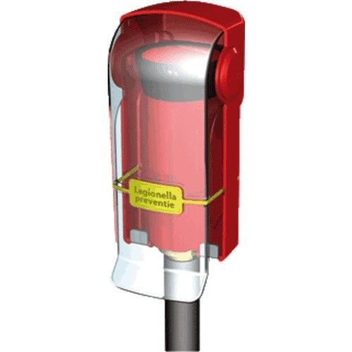 Muurhouder straalpijp met zegel. Bij uitname van de straalpijp wordt het zegel gebroken waarbij de transparante afdekkap omhoog gaat. Bij niet toegestaan gebruik is dan direct zichtbaar dat er iemand aan de straalpijp heeft gezeten. Omdat er een verzegeling wordt toegepast wordt het risico op sabotage verkleind en draagt bij aan legionellapreventie. Omdat de straalpijp zich onder de kap bevindt worden de water doorlaat openingen tegen stof en vuil beschermd. Verstopping, door kauwgom bijvoorbeeld, wordt ook voorkomen.
