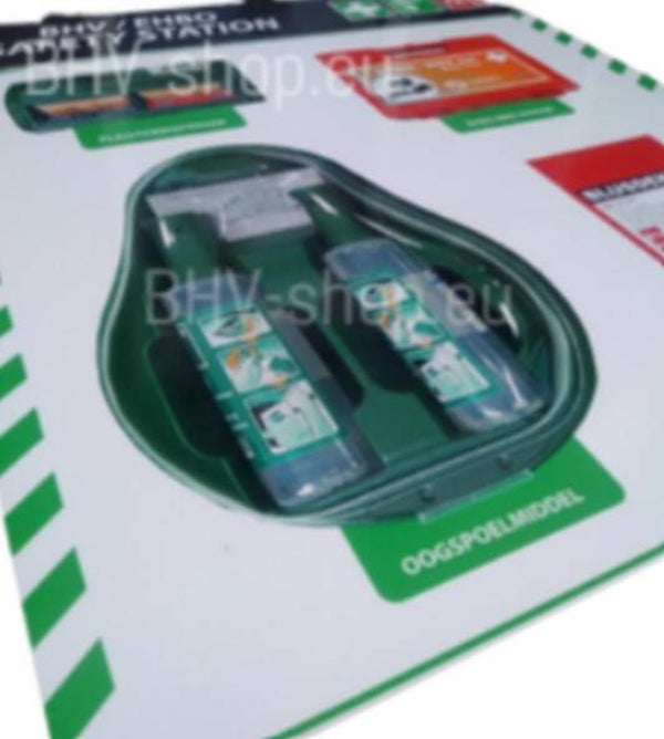 Veiligheidsbord BHV EHBO artikelen. Fraai veiligheidsbord met wandpaneel 75x90cm inclusief wand afstandhouders. EHBO wandsysteem inclusief EHBO verbandkoffer, blusdeken van 1.20 x 1.20 meter, oogspoelstation met spiegeltje twee flacons 500ml steriel oogspoelmiddel afgedekt met transparante afdekkap voor optimale hygiene, pleisterdispenser met 40 textielpleisters en 45 plastic PE pleisters. EHBO artikelen overzichtelijk en centraal op één bord. Monteer het bord op een strategisch punt aan de wand (entree, kantine, receptie) zodat eenieder direct zicht op het bord heeft. Let op dat bij levering de EHBO artikelen niet aan het bord maar los worden meegeleverd. Door middel van tape, kit of popnagels bevestigt uzelf de artikelen aan het bord. De levertijd kan varieren echter altijd z.s.m. Neem contact met ons op. Bestel veilig online EHBO veiligheidsbord.